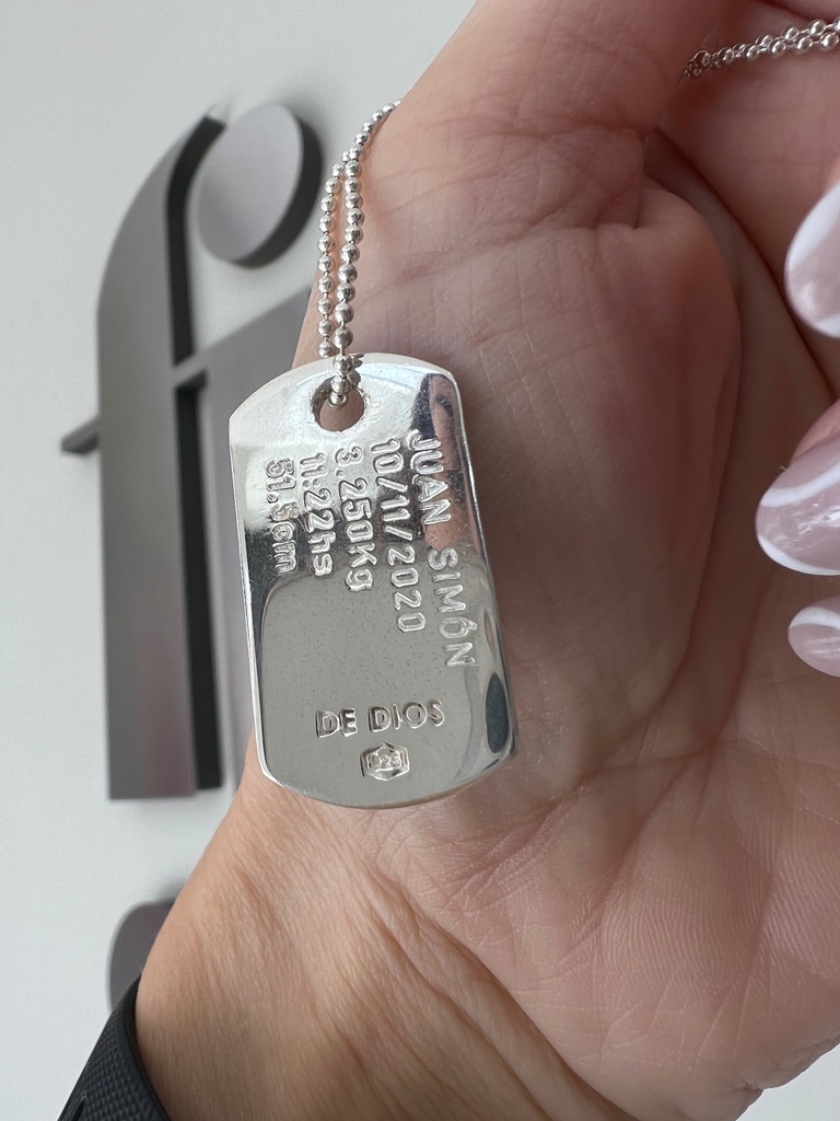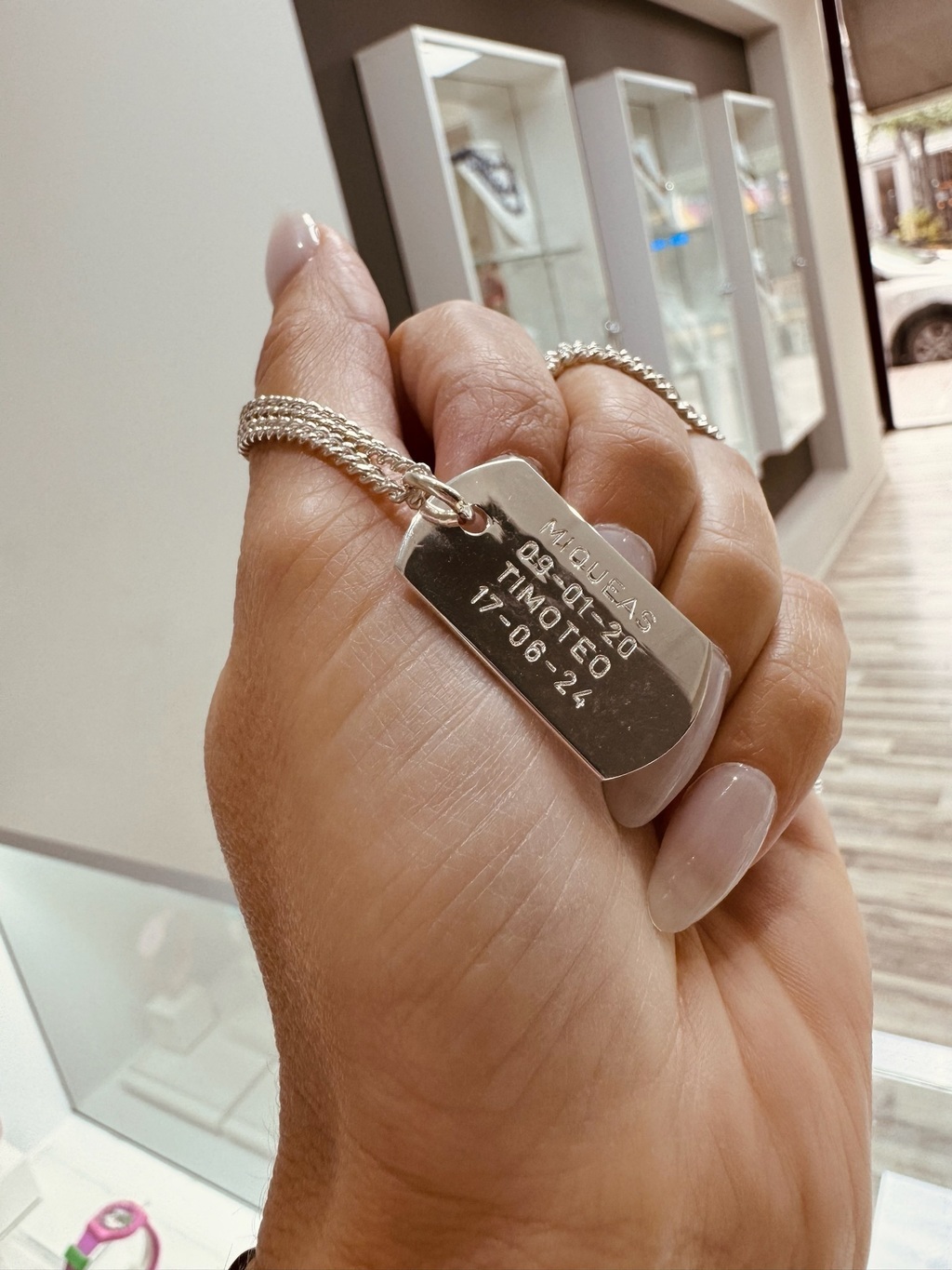 Cadena grumet de 60 cm de largo, con chapa grabada, de plata 925.