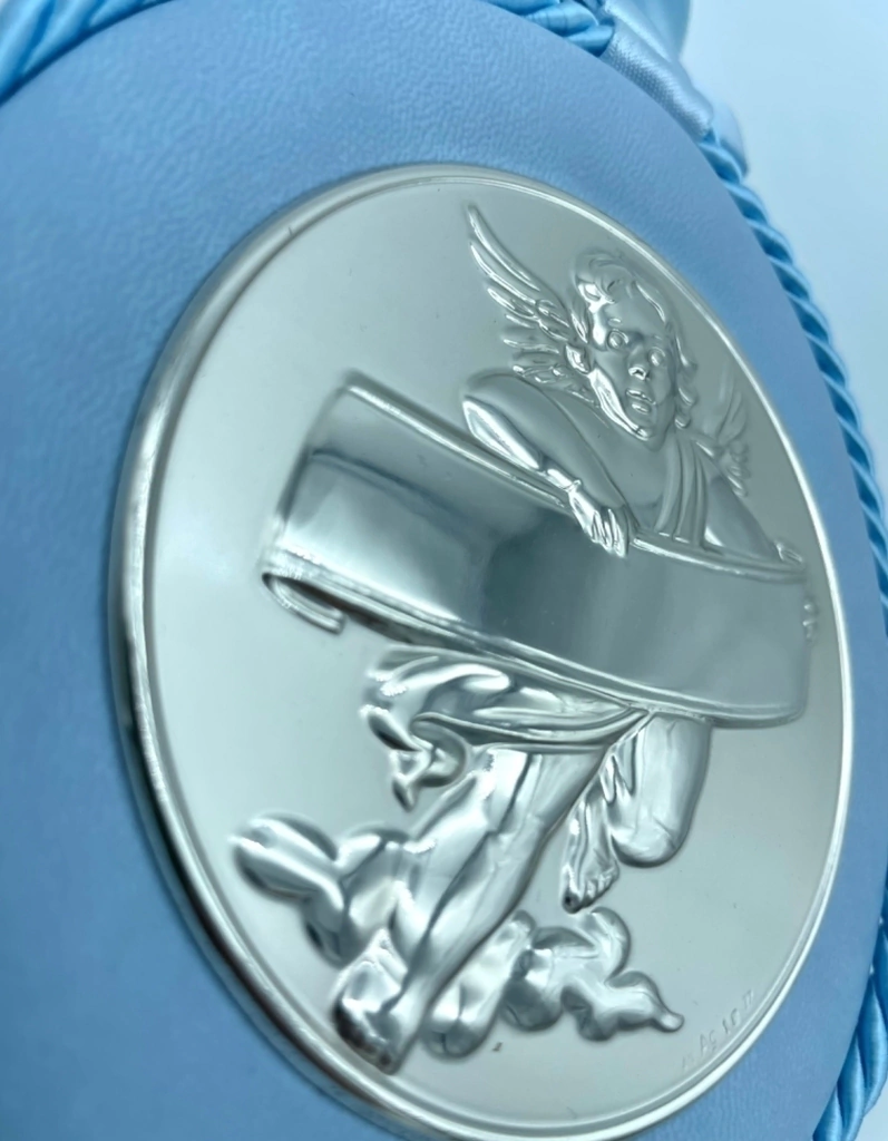 Cunero de plata de 128 mm con cinta de tela y tapa trasera de cuerina . Importado italiano. Puede grabarse, indicar en observaciones. El precio incluye grabado.