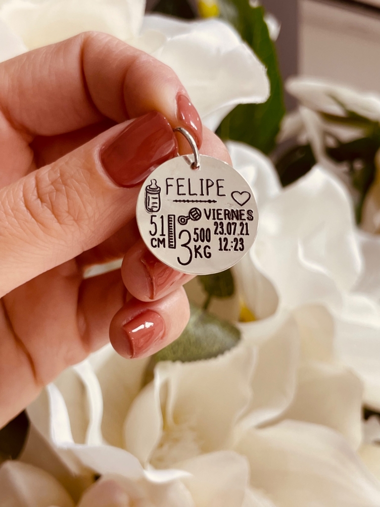 Medalla de plata 925 con datos de nacimiento grabados. Tamaño: 22 mm