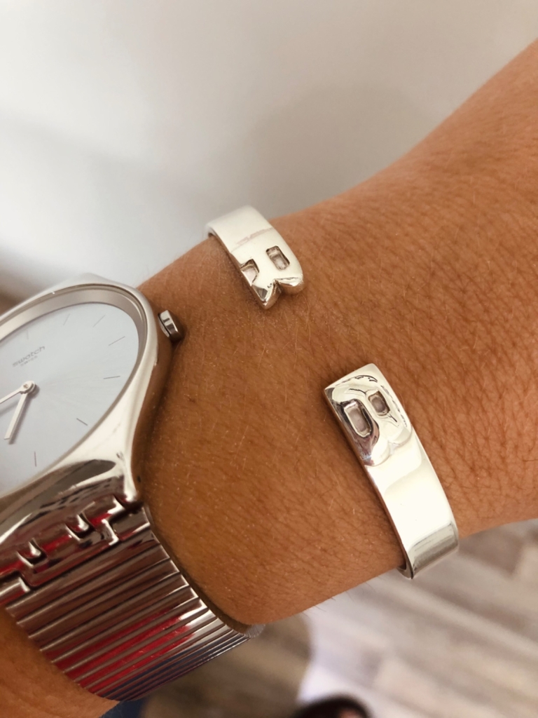 Brazalete abierto de plata 925, con letras en puntas, de 6 mm de ancho.